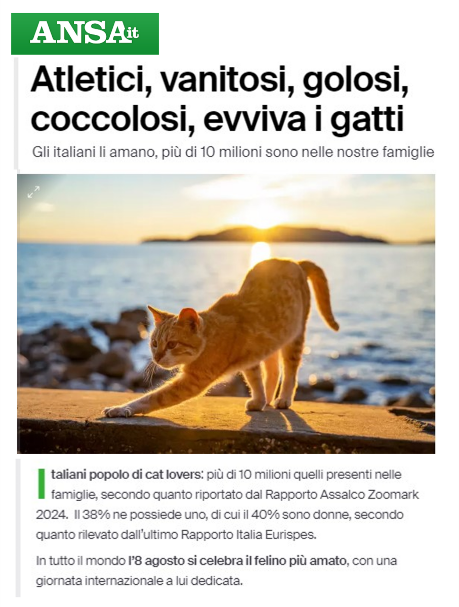 Ansa.it: Atletici, vanitosi, golosi, coccolosi, evviva i gatti 8 Agosto 2024 Home » Media & News » Ansa.it: Atletici, vanitosi, golosi, coccolosi, evviva i gatti