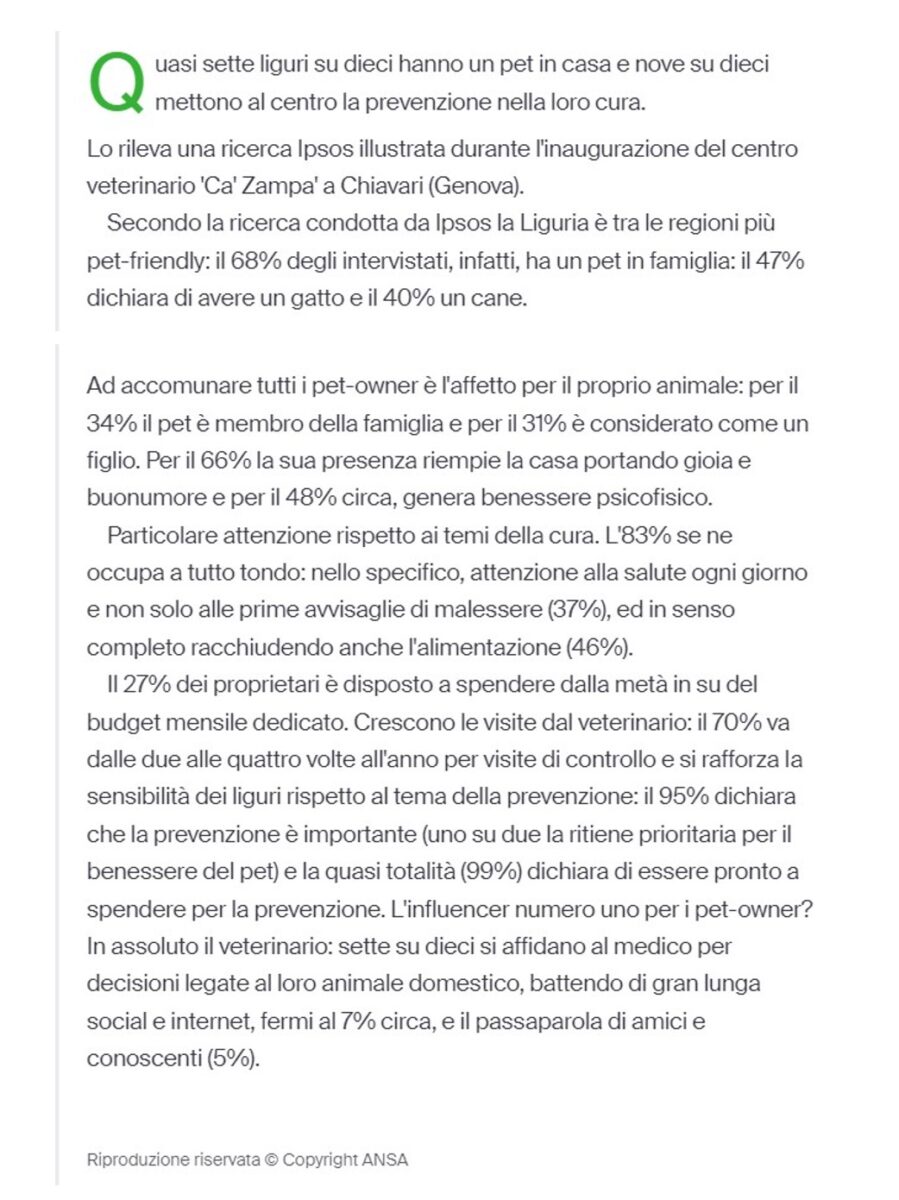 Ansa.it: Ipsos, sette liguri su dieci hanno un pet in casa 12 Maggio 2024 Home » Media & News » Ansa.it: Ipsos, sette liguri su dieci hanno un pet in casa