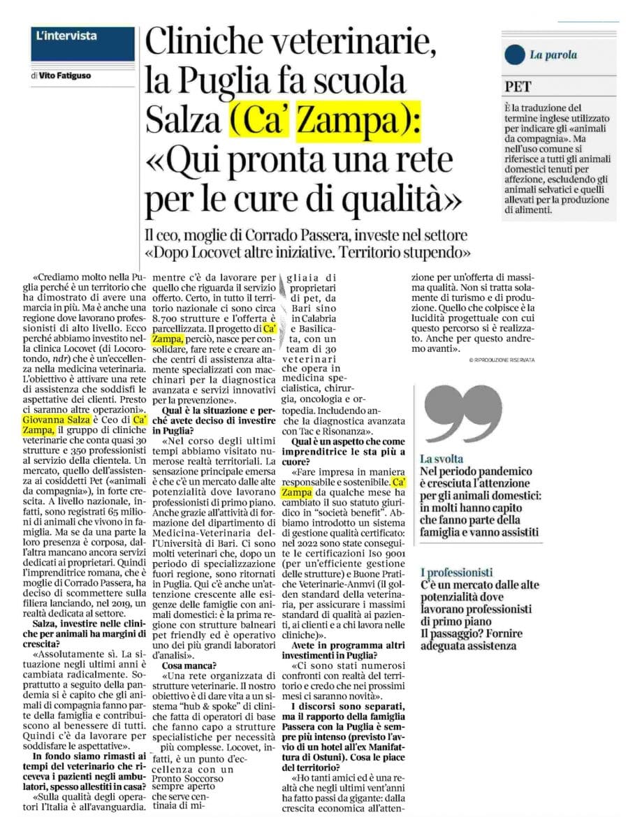 Corriere del Mezzogiorno: Curare gli animali investendo in Puglia. Intervista al CEO Giovanna Salza 27 Marzo 2024 Home » Media & News » Corriere del Mezzogiorno: Curare gli animali investendo in Puglia. Intervista al CEO Giovanna Salza