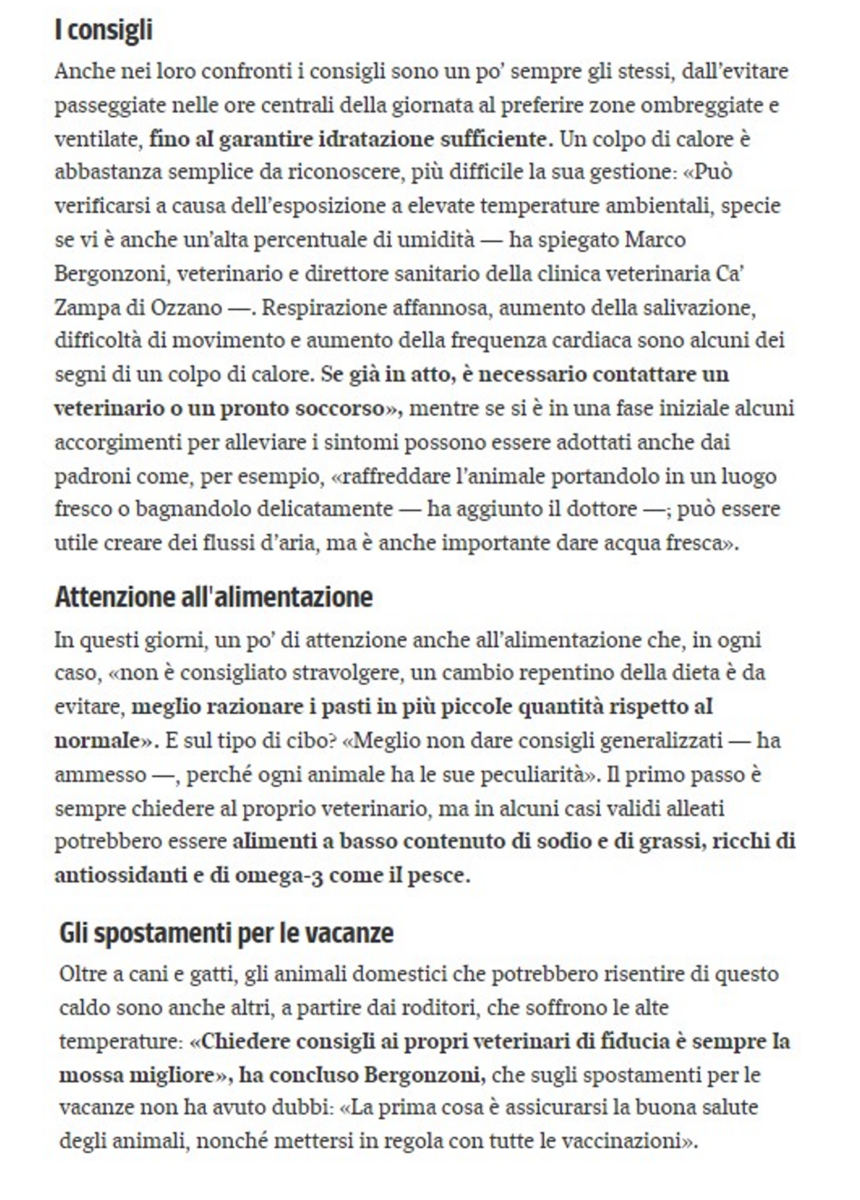 Corriere di Bologna.it (Corriere della Sera): Anche i cani e i gatti soffrono la calura “Razionare i pasti e creare flussi d’aria“