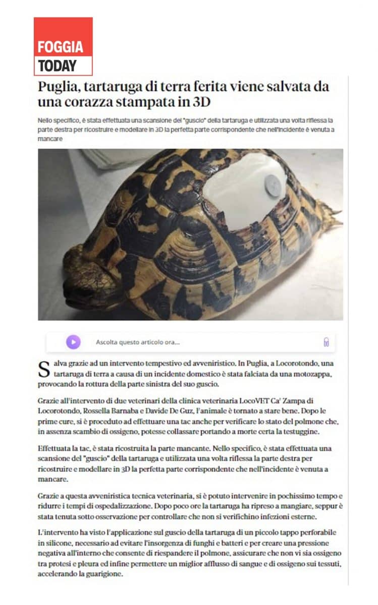 Home » Media & News » FoggiaToday: Puglia, tartaruga di terra ferita viene salvata da una corazza stampata in 3D