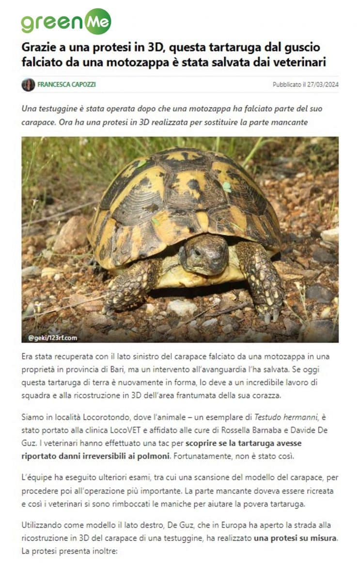 greenMe: Grazie a una protesi in 3D, questa tartaruga dal guscio falciato da una motozappa è stata salvata dai veterinari 27 Marzo 2024 Home » Media & News » greenMe: Grazie a una protesi in 3D, questa tartaruga dal guscio falciato da una motozappa è stata salvata dai veterinari