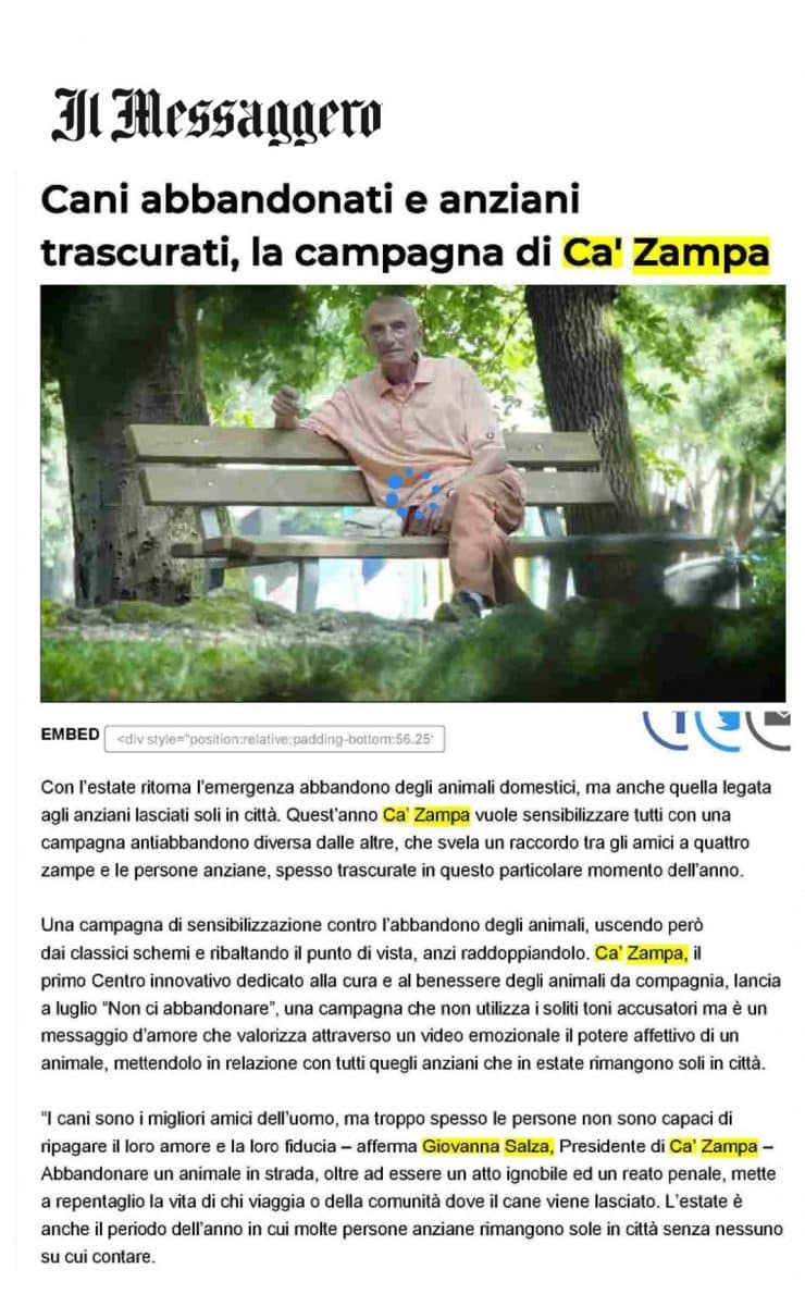 Il Messaggero.it: Cani abbandonati e anziani trascurati, la campagna di Ca’ Zampa 25 Luglio 2019 Home » Media & News » Il Messaggero.it: Cani abbandonati e anziani trascurati, la campagna di Ca’ Zampa