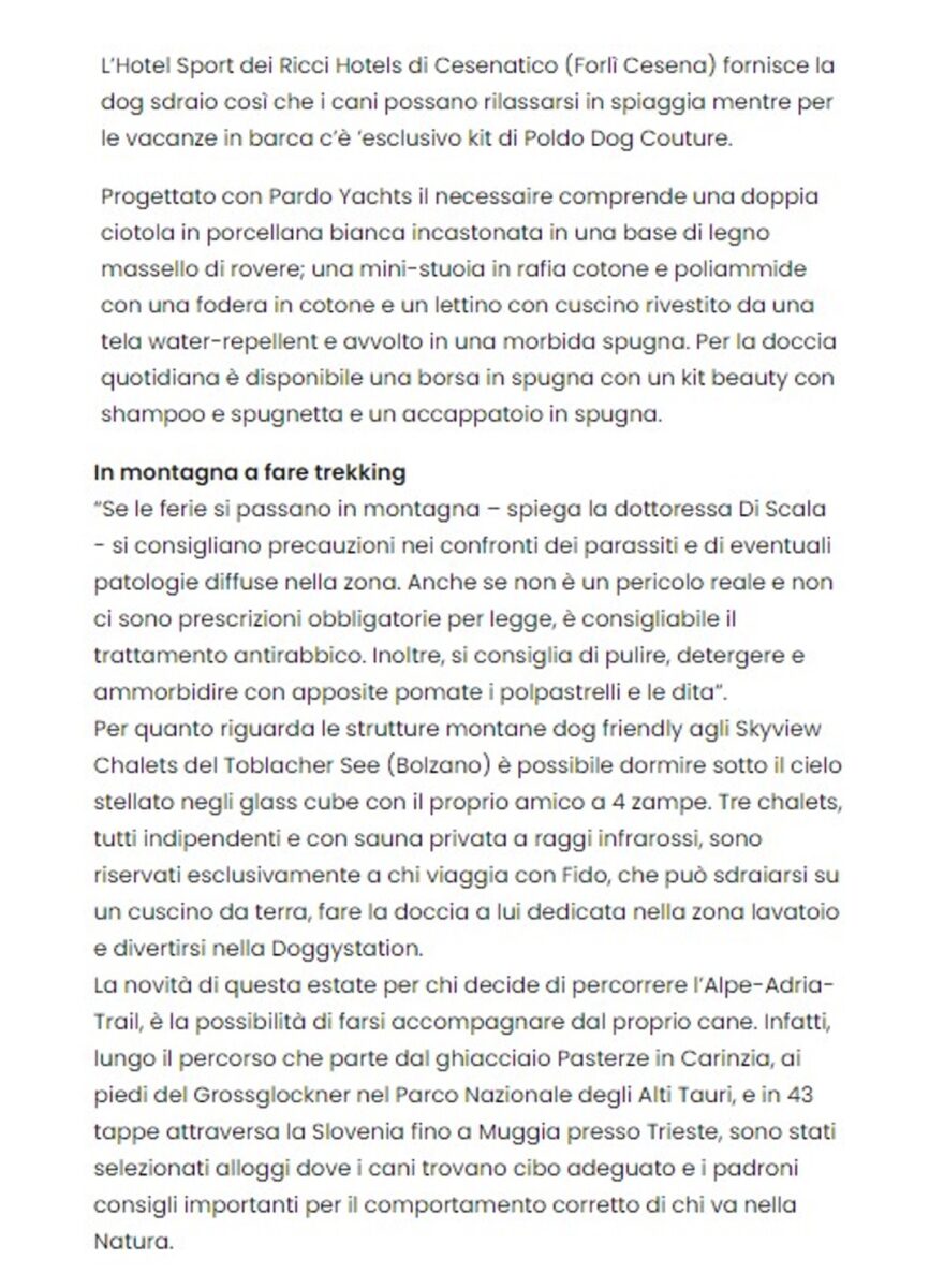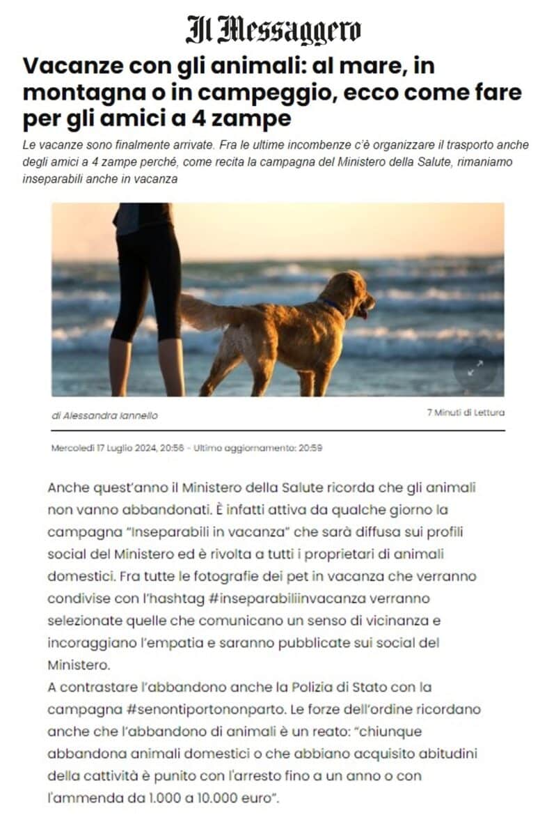 Il Messaggero: Vacanze con gli animali al mare, in montagna o in campeggio 17 Luglio 2024 Home » Media & News » Il Messaggero: Vacanze con gli animali al mare, in montagna o in campeggio