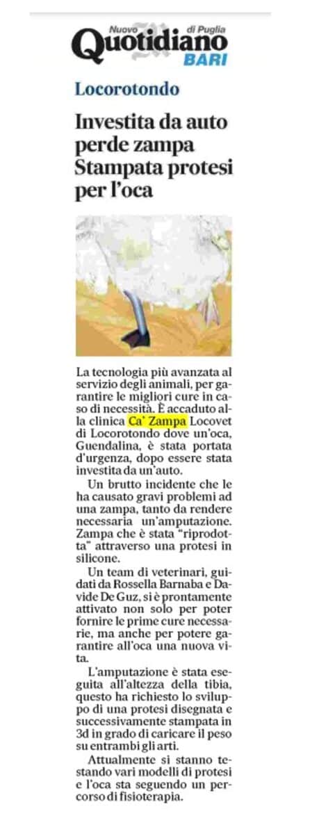 Nuovo Quotidiano di Puglia: Investita da auto perde zampa. Stampata protesi per l’oca 23 Giugno 2024 Home » Media & News » Nuovo Quotidiano di Puglia: Investita da auto perde zampa. Stampata protesi per l’oca