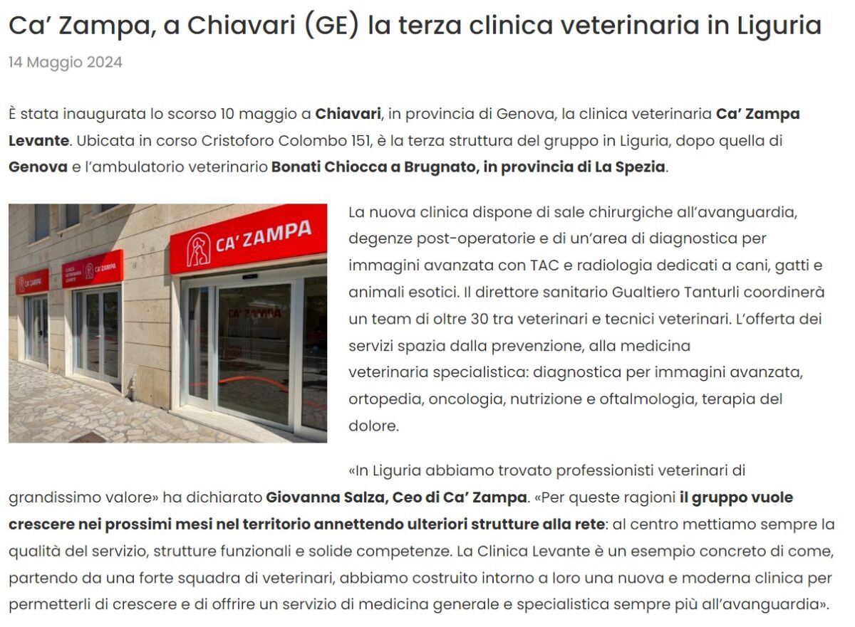 Pet B2B.it: Ca’ Zampa, a Chiavari (GE) la terza clinica veterinaria in Liguria 14 Maggio 2024 Home » Media & News » Pet B2B.it: Ca’ Zampa, a Chiavari (GE) la terza clinica veterinaria in Liguria