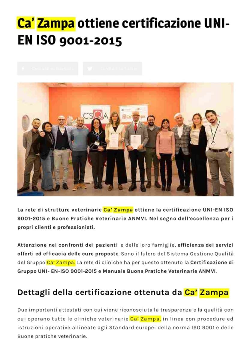 Pet Family: Ca’ Zampa ottiene certificazione UNI-EN ISO 9001-2015 29 Dicembre 2022 Home » Media & News » Pet Family: Ca’ Zampa ottiene certificazione UNI-EN ISO 9001-2015