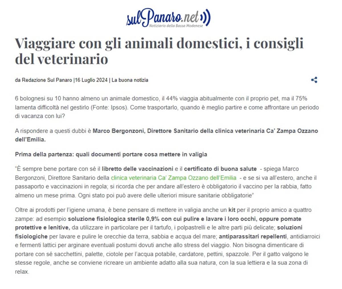 Sul Panaro.net: Viaggiare con gli animali domestici, i consigli del veterinario 16 Luglio 2024 Home » Media & News » Sul Panaro.net: Viaggiare con gli animali domestici, i consigli del veterinario